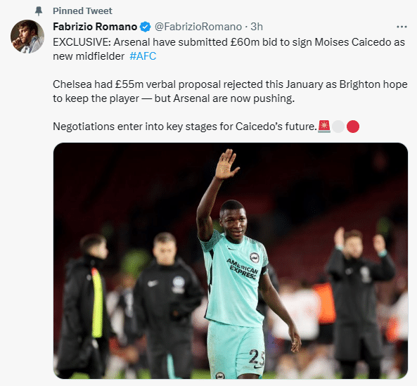 罗马诺表示:阿森纳向布莱顿报价6000万镑,求购莫伊塞斯·凯塞多作为新中场。