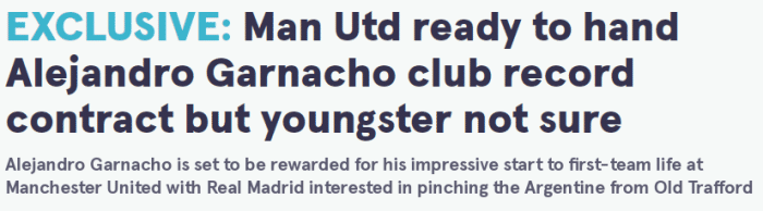 《镜报》称,曼联打算为加纳乔开出队史最长的8年合约,周薪为3.2万镑,但加纳乔方面不想签下4年以上的合约。