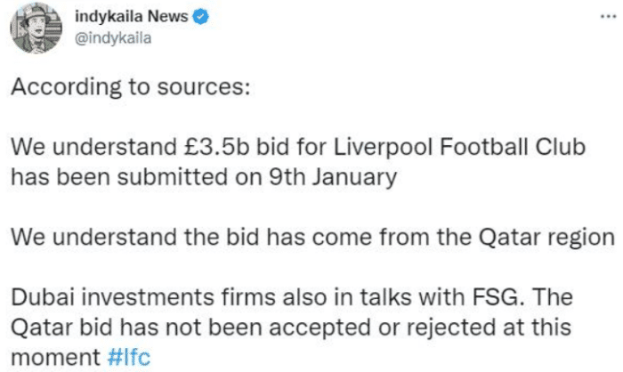该记者表示,在1月9日时就有来自卡塔尔的财团报价35亿英镑收购利物浦,他们对这个项目很感兴趣。
