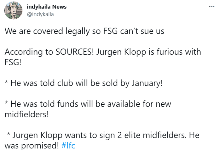178直播01月09日讯 据利物浦新闻记者indykaila(球迷给其绰号绿帽哥)报道,利物浦主帅克洛普对芬威集团感到愤怒和不满。