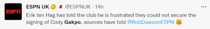 滕哈格与加克波有着相同的经纪人公司,两人也曾在埃因霍温有过合作,当时曼联主帅还是球队的青训教练。此前,滕哈格被问到关于加克波的转会时还面带微笑,似乎一切尽在掌握。
