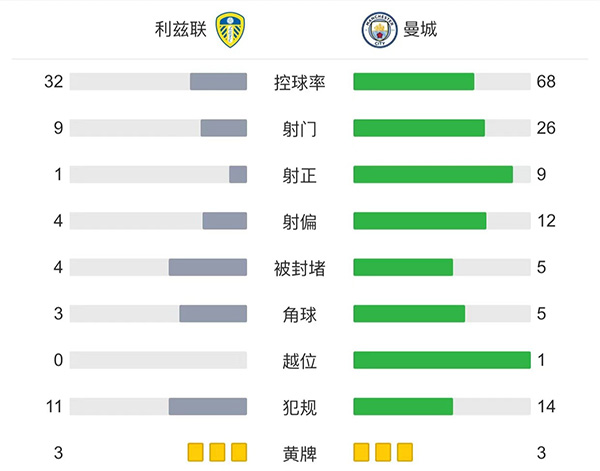全场比赛结束,最终曼城3-1利兹联,回到积分榜第二位。