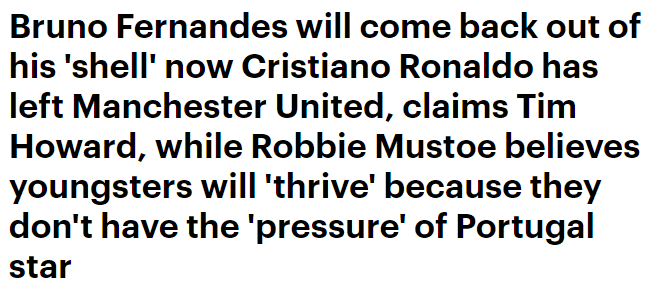 霍华德说:“C罗回到曼联之前,B费是这支球队的绝对核心。但在C罗回归之后,B费就有些迷失了,他无法再像之前那样踢球。现在C罗离队,之前的那个B费就要回来了。”