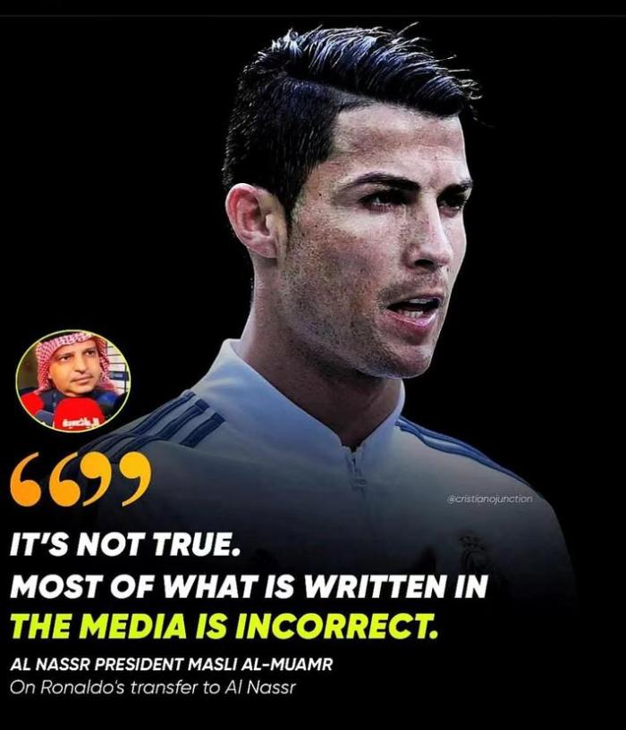 在被问到C罗是否将要加盟时,利雅得胜利主席在接手采访时说:“这不是真的,关于这件事情大部分媒体的报道都是错误的。”