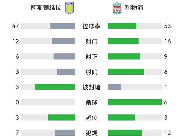 全场比赛结束,最终利物浦3-1维拉。