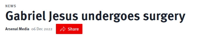 今天,阿森纳证实球员已经接受了手术,而巴西媒体爆料称,热苏斯将需要缺阵数个月时间。