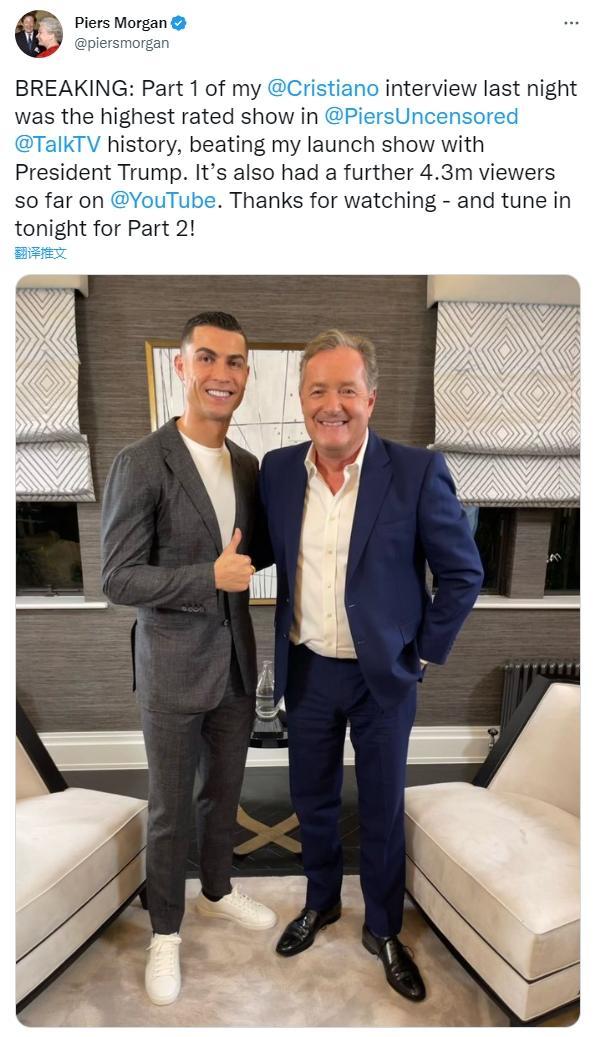 摩甘在推特上写道:C罗专访的第一部分创下PiersMorganUncensored和TalkTV收视纪录,收视率击败了我和川普总统的午间采访,而且迄今为止在油管上还有450万观众。记得收看今晚的专访第二部分。