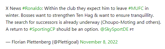 队内预计他冬窗会离队,有可能回归老东家葡萄牙体育,红魔的锋线目标则包括