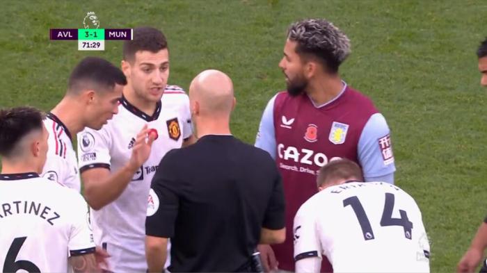 达洛染黄时,曼联拿到了一个前场任意球,这意味着他并非因为犯规被警告,而是由于言语过激导致。当时被犯规的是C罗,与达洛没有任何关系,但慢镜显示,他曾跑到主裁安东尼·泰勒面前说了些什么,随后就被黄牌警告。