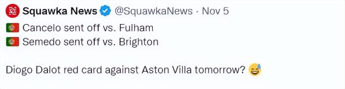 有人怀疑,达洛是主动申请黄牌,以便在世界杯前可以提前休息一场,这被英国《每日邮报》称为「战术性染黄」!有趣的是,葡萄牙队的3名右后卫本轮都拿了红黄牌,曼城的坎塞洛和狼队的塞梅多在周六的英超比赛中分别被罚下,而达洛则疑似主动申请黄牌停赛。