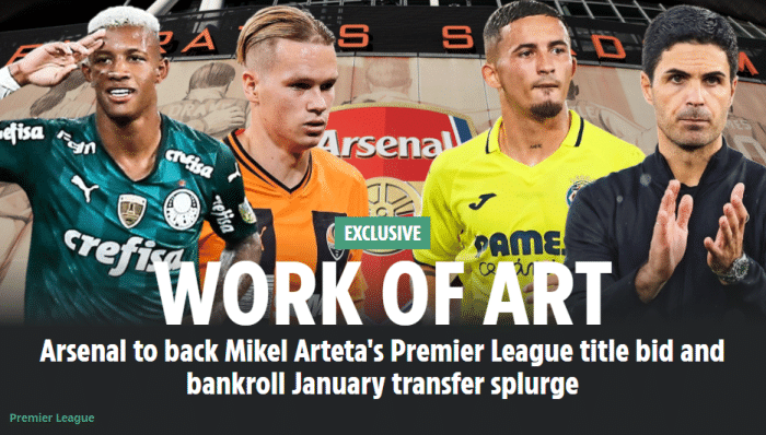 178直播10月26日《太阳报》独家消息,阿森纳冬窗将提供阿尔特塔5000万英镑引援资金,以冲击英超冠军。