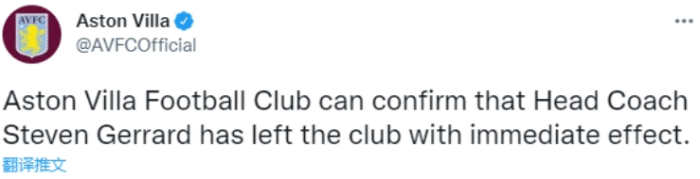 维拉官方写道:“感谢杰拉德的辛勤付出,祝愿他未来一切顺利。”