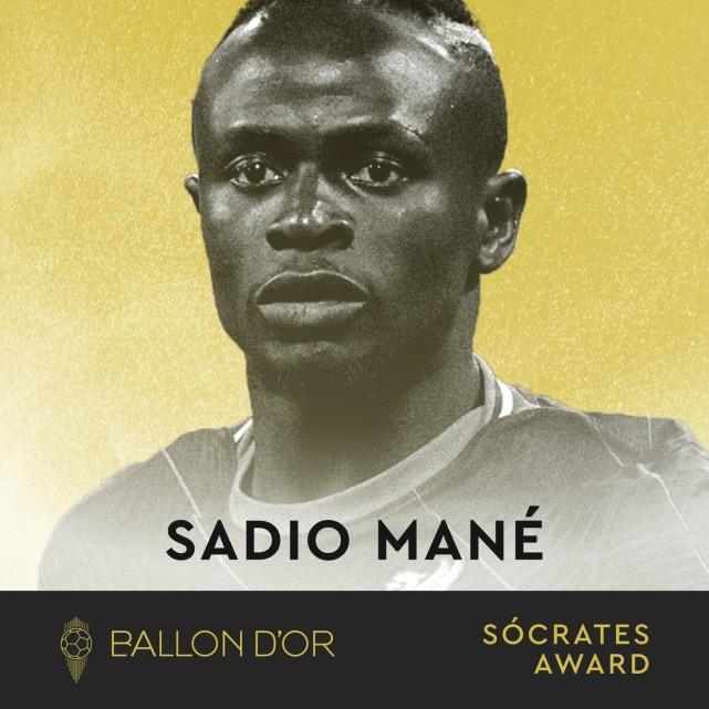 苏格拉底奖是金球奖官方今年增设的奖项,表彰为参与社会和慈善项目的足球运动员。马内上赛季出场51场,23球5助。获得了非洲杯冠军,足总杯,联赛杯。