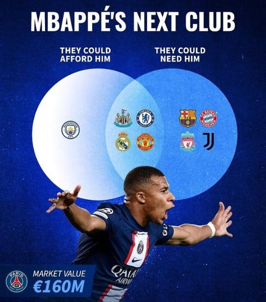 德转用集合列出买得起姆巴佩的下家有曼城、纽卡斯尔、切尔西、皇马和曼联,但需要他且买得起的是后四家。