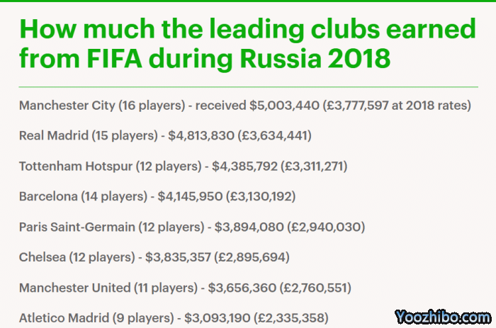 在2018年,国际足联为参赛球员向各家俱乐部支付了1.8亿欧元补偿,当时一名国脚每天只给7300欧元。英国《每日邮报》称,这届世界杯虽然只有29天,但由于在欧洲赛季中期进行,FIFA提高了球员参赛补偿。