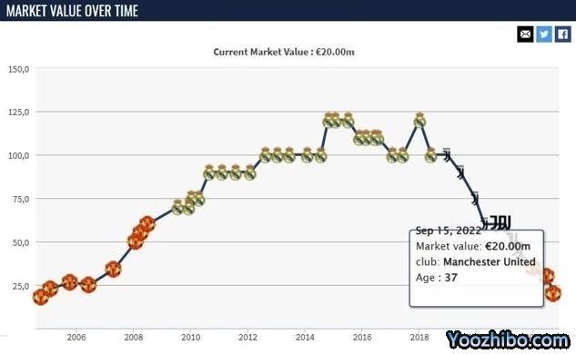 今年6月德国《转会市场》更新时,C罗的身价为3000万欧元,但仅仅3个月的时间C罗的身价再度暴跌1000万欧元。而葡萄牙巨星曾在2014年10月至2015年7月,以及2018年1月身价曾达1.2亿欧元,达到了生涯的最高峰。但4年来,他身价直线下跌1亿欧元。