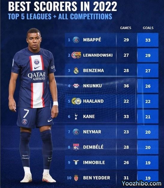 178直播讯 北京时间09月13日 ,德国转会市场盘点了五大联赛球员2022年射手榜,姆巴佩33球居首,莱万27球位列第二,本泽马排名第三。
