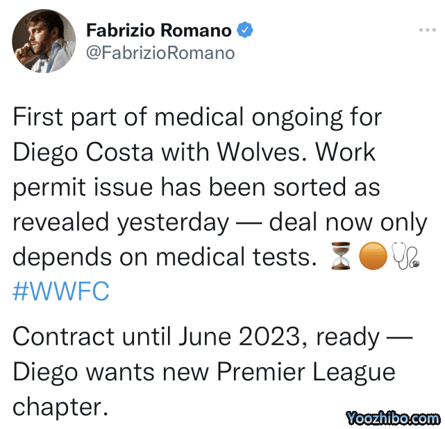 此前,困扰迭戈-科斯塔重返英超的劳工证问题已经得到了解决。这位巴西籍的西班牙射手已经完成了在狼队的第一部分体检。现在,迭戈-科斯塔的加盟只取决于体检结果。不出意外的话,迭戈-科斯塔将与狼队签下一份为期1年的短约,至2023年6月。由于科斯塔是自由身加盟,狼队将不需要为他支付任何转会费。