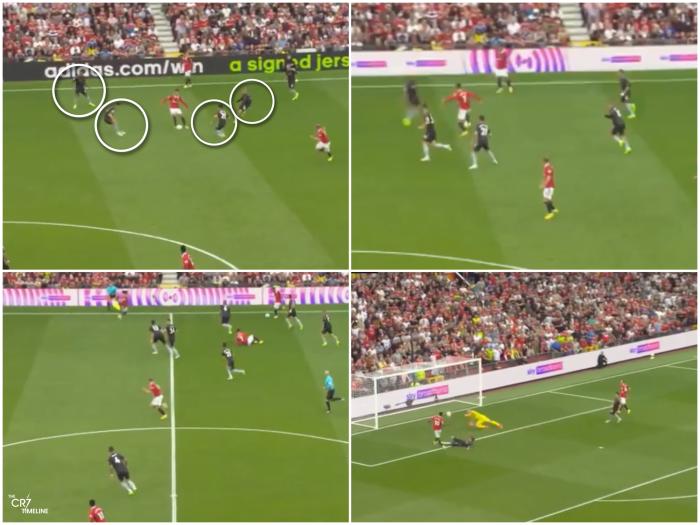 但这并不代表C罗毫无作用,例如曼联3-1锁定胜局的进球中,C罗一人持球吸引了4名阿森纳防守球员的注意,给埃里克森制造了从后插上的空档,而葡萄牙老将随后将球传给B费,后者直塞送埃神形成单刀,并最终助攻拉什福德射空门得手。