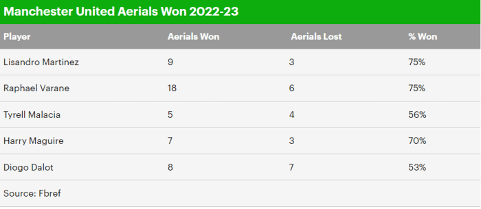 阿根廷国脚已经得到曼联8月份的最佳球员,在红魔3-1击败阿森纳的比赛中,马丁内斯也表现出色。数据显示,曼联6700万欧元新援迄今12次争夺头球,只有3次输掉,成功率75%;而在地面球争夺中,他的8次对抗则有7次赢得球权。与之对比,最近失去主力位置的曼联队长马奎尔,10次争夺头球也输了3次,头球成功率70%,低于马丁内斯。