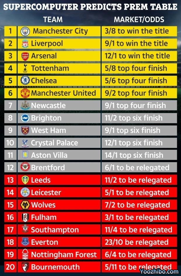 178直播08月24日讯 据《太阳报》报道,超级计算机预测本赛季英超冠军将由曼城获得,利物浦、阿森纳和热刺则分别排名2-4位。