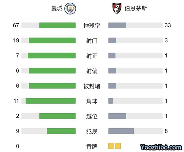 全场比赛结束,曼城4-0伯恩茅斯。