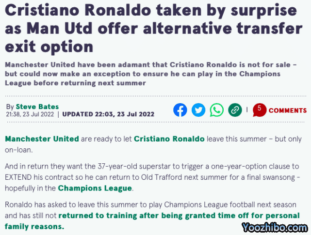 178直播07月24日讯 ,来自英国知名媒体《每日镜报》的独家消息,曼联俱乐部决定选择妥协,同意放C罗离队。不过曼联放行C罗也是有条件的,那就是C罗必须先续约1年,然后以租借的方式离队,明年夏天再回归曼联。
