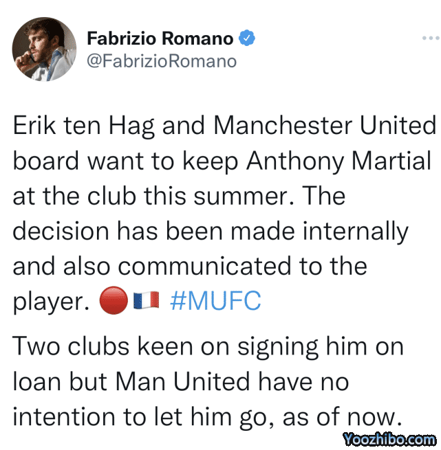 178直播07月23日讯 凌晨,来自知名转会专家罗马诺的消息,曼联主帅滕哈格和俱乐部高层在内部沟通后,已经决定并通知法国射手马夏尔,新赛季他将会留在曼联。罗马诺透露,有两家俱乐部有意租借马夏尔,但目前曼联无意让他离开。