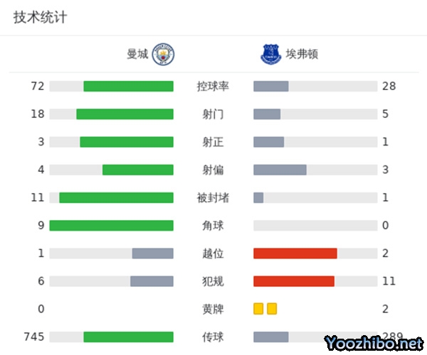 全场比赛结束,曼城2-0战胜埃弗顿。