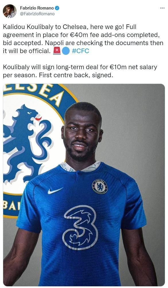 这位记者表示,库利巴利的转会费为4000万欧元外加浮动条款,各方已完全达成协议,那不勒斯也接受了切尔西的报价,正在审核,即将签约。
