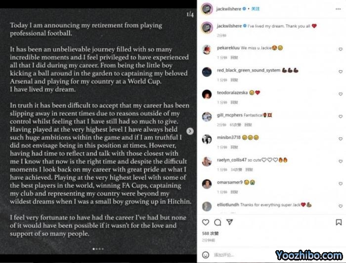 威尔希尔在INS发表长文,称他实现了自己的梦想,感谢所有人,最后配文“加油枪手”。