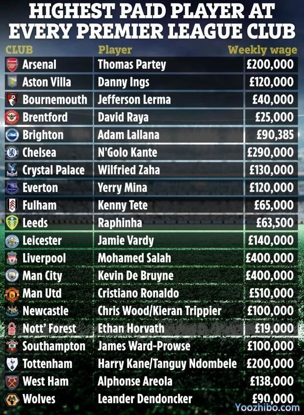178直播07月04日讯 《太阳报》援引Sportrac数据,统计了英超各队薪水最高的球员。