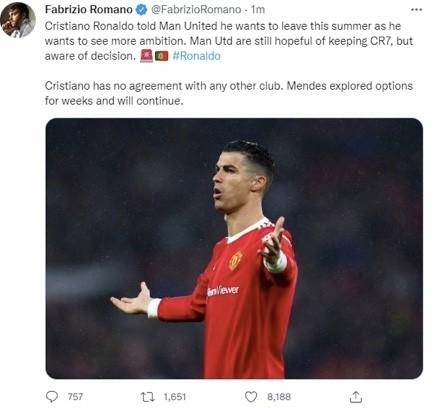 178直播07月03日讯 在《泰晤士报》率先曝光C罗希望今夏离开曼联后,北京时间7月3日凌晨,知名转会专家罗马诺也证实了C罗确实想走。罗马诺表示,C罗想看到曼联展现更大的野望,但现状却让人很失望。