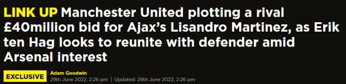 178直播06月30日讯据talkSPORT电台报道,阿森纳向阿贾克斯开出3500万英镑的报价求购后卫利桑德罗-马丁内斯,而曼联则开价4000万英镑希望截胡。