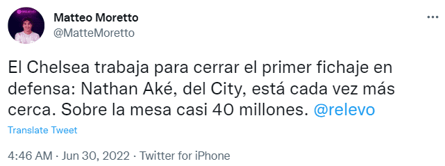 178直播06月30日讯 Relevo记者马特奥-莫雷托报道,切尔西为曼城后卫阿克报价4000万欧元,已接近签下他。