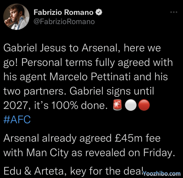 178直播06月27日讯 日凌晨,知名转会专家罗马诺在个人社交账号上确认,巴西射手热苏斯的经纪人已经与阿森纳俱乐部达成协议。双方将签约5年至2027年。而热苏斯也将成为继马尔基尼奥斯和法比奥-维埃拉之后,阿森纳夏窗的第三位新援。
