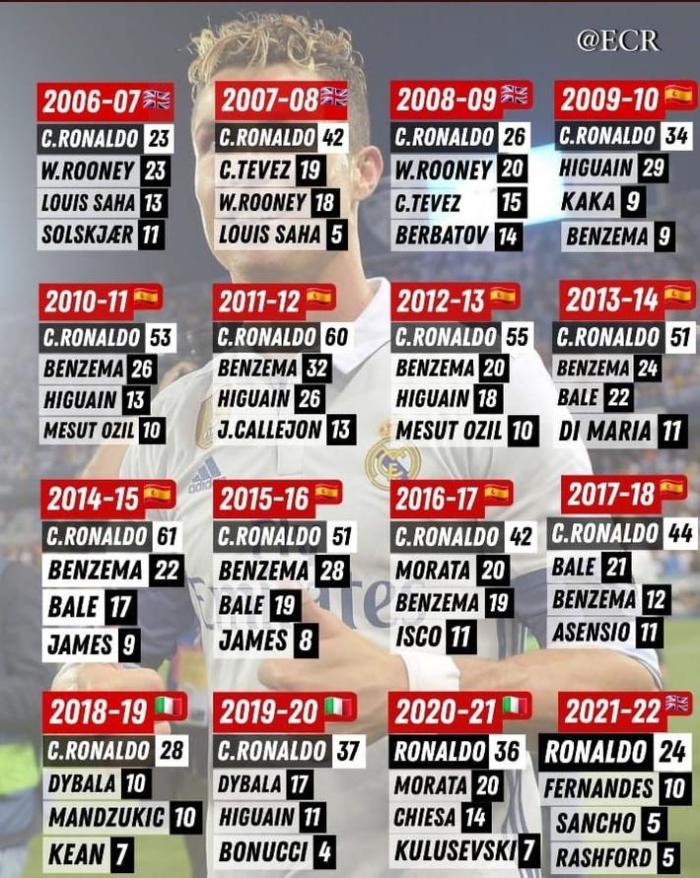 从2006-07赛季开始,C罗就开始了连续16个赛季加冕队内射手王的霸道征程,纵横曼联、皇马和尤文图斯三大豪门。