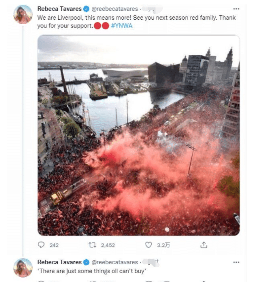 不过她配了一张利物浦两年前欧冠夺冠游行的照片,要知道红军刚刚在欧冠决赛中输球,这遭到曼城球迷的嘲讽:“石油肯定买不到回收利用的照片。”