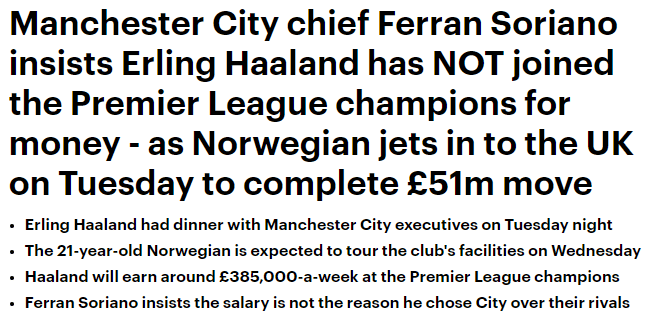根据此前消息,哈兰德在曼城的周薪为38.5万英镑,他的转会费为5100万英镑。