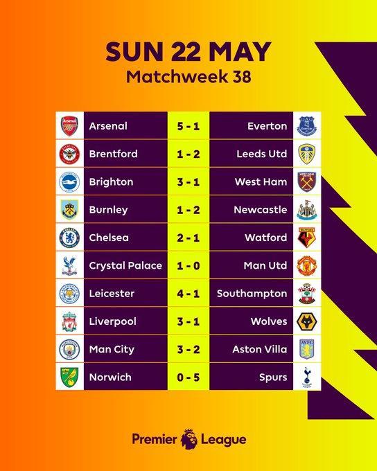 178直播05月23日讯 英超第38轮,曼城3-2维拉,利物浦3-1狼队,切尔西2-1沃特福德,阿森纳5-1埃弗顿,热刺5-0诺维奇,传统六巨头里只有曼联0-1输给了水晶宫。