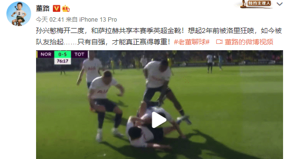 知名足球人董路在社交媒体上谈到了孙兴慜获得英超金靴,同时联想到2年前与洛里的冲突,表示:“孙兴慜梅开二度,和萨拉赫共享本赛季英超金靴!想起2年前被洛里狂喷,如今被队友抬起……只有自强,才能真正赢得尊重!”