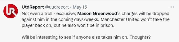 今年4月,格林伍德的第一次取保候审到期,大曼彻斯特警方将期限延长到了6月。但「知情人士」称,格林伍德可能用金钱赔偿打通关系,最终得到谅解,免遭起诉,从而逃过一劫。这一说法是否真实有待时间检验,因为此前也曾传闻格林伍德将恢复训练,结果证实纯属虚构。
