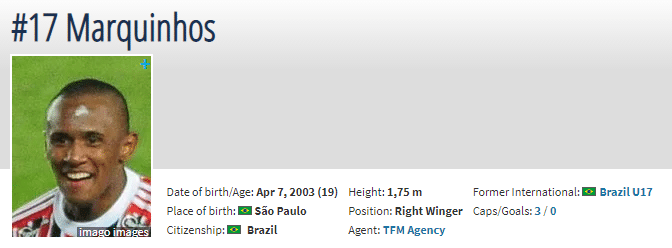 小马尔基尼奥斯司职右边锋,本赛季为圣保罗出战15场贡献3球1助攻。