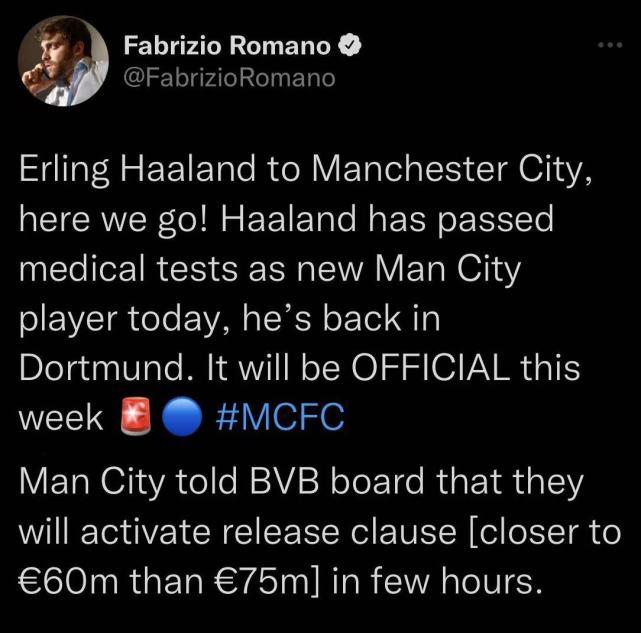 罗马诺写道:“哈兰德去曼城,交易达成!哈兰德今天已经通过了曼城体检,挪威天才本人希望自己加盟曼城的官宣公告,能在本周之内发出。”
