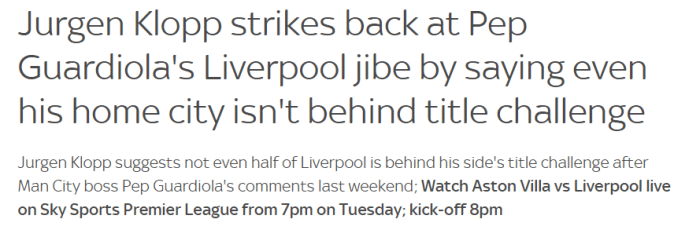 克洛普反击了瓜帅:“我住在利物浦,是的,这里很多人希望我们夺冠,但即使在利物浦,也许只有一半的人支持我们。”