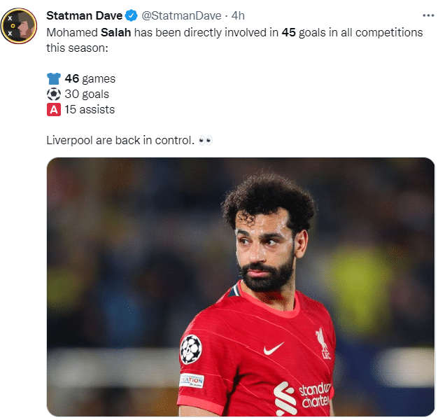 178直播05月04日讯 根据数据统计,萨拉赫本赛季各项赛事46场比赛已造45球。