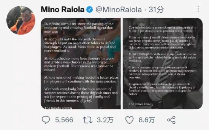 MinoRalola写道:“满怀着无尽的悲伤,我们在这里告知大家:这位有史以来最有爱心、最了不起的足球经纪人的去世了。”