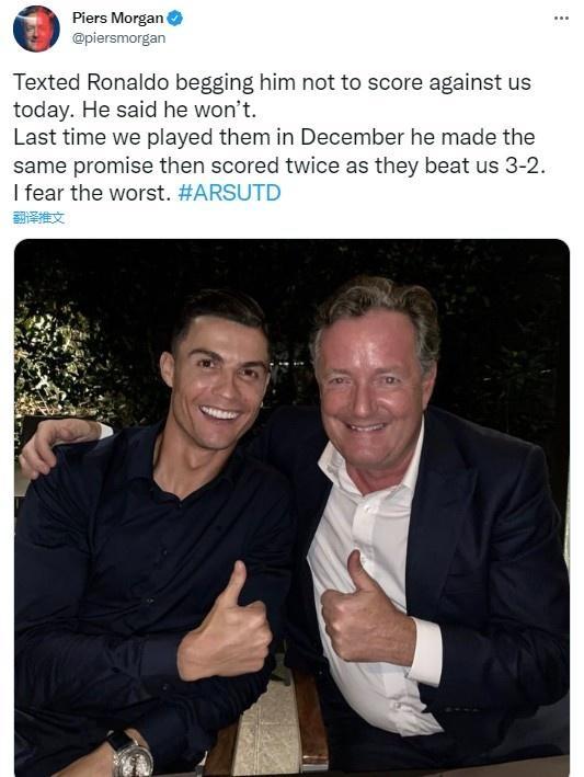 178直播04月24日讯 消息,著名枪迷皮尔斯-摩甘在推特上称他发短信请求C罗对阿森纳不要进球。