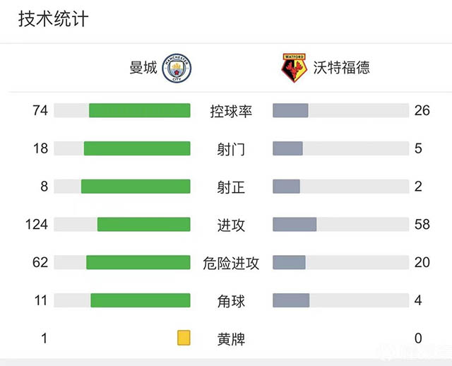 最终全场比赛结束,曼城5-1战胜沃特福德。
