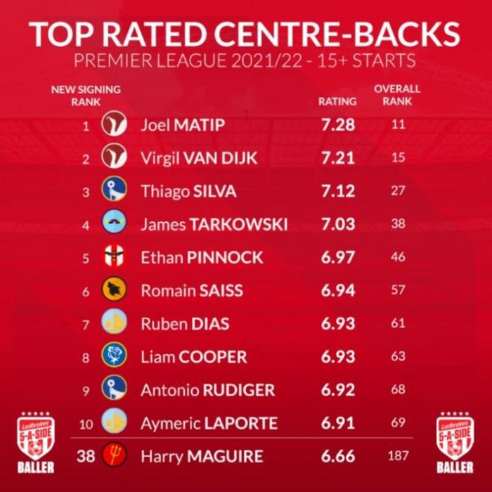 178直播04月23日讯 消息,数据网站whoscored为本赛季至少首发15次的英超中卫评分,利物浦搭档马蒂普和范迪克位居前两位,马奎尔位居第38位。